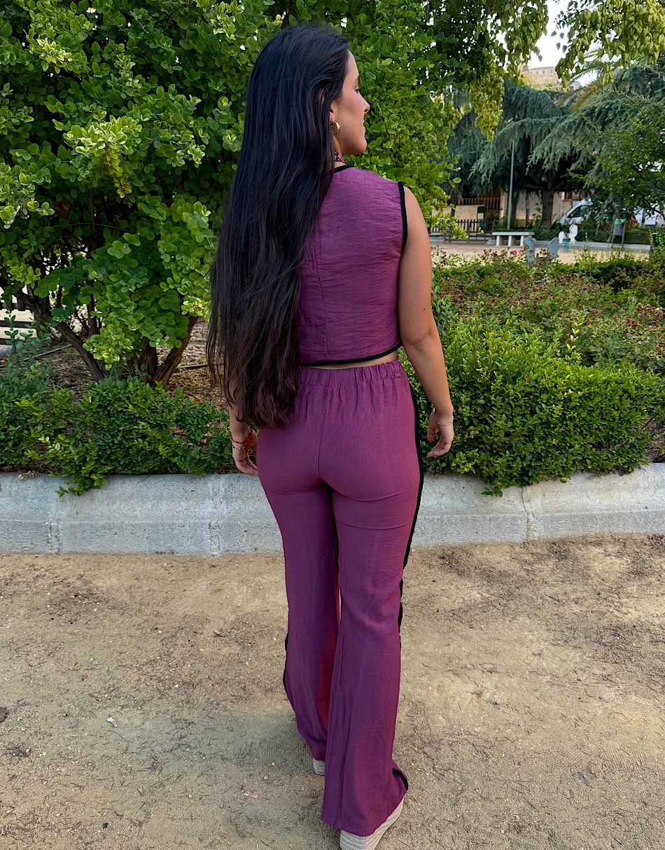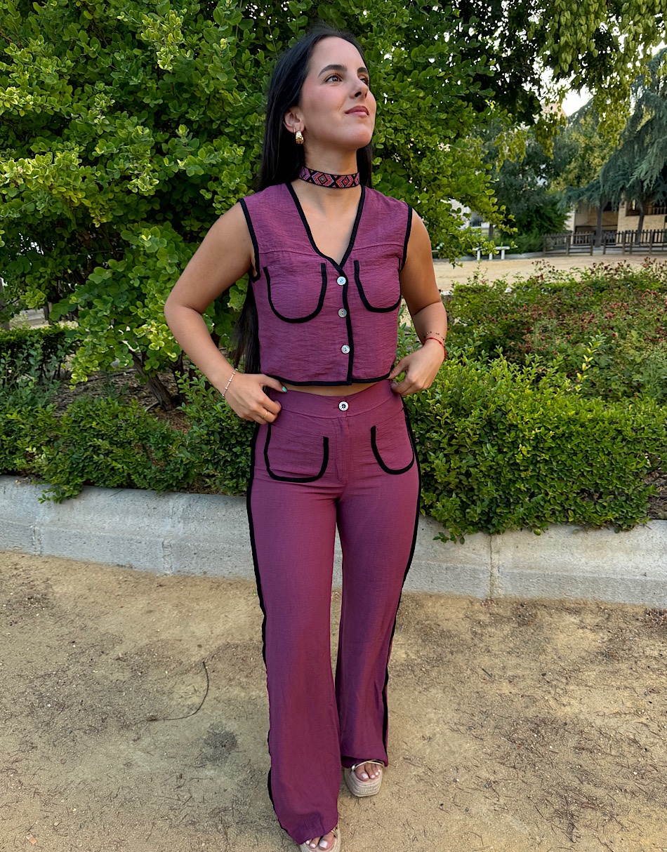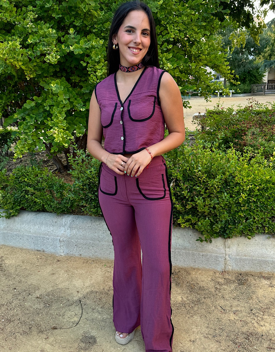 La modelo lleva talla S del top. Y talla L del pantalón.