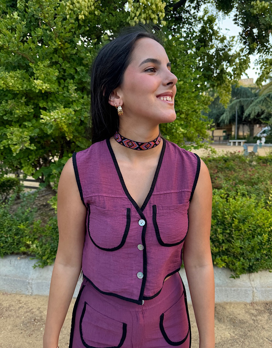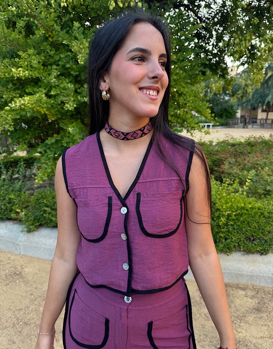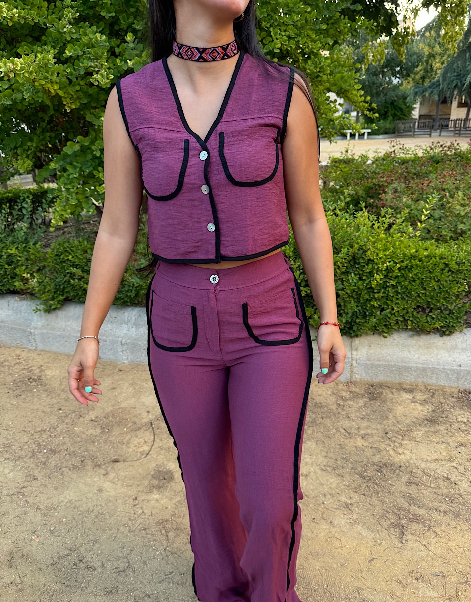 La modelo lleva talla S del top. Y talla L del pantalón.