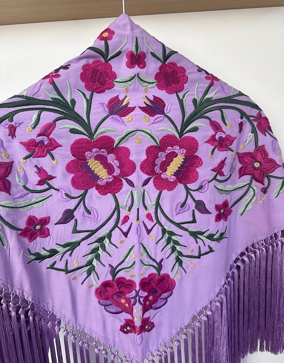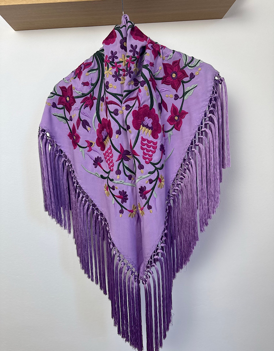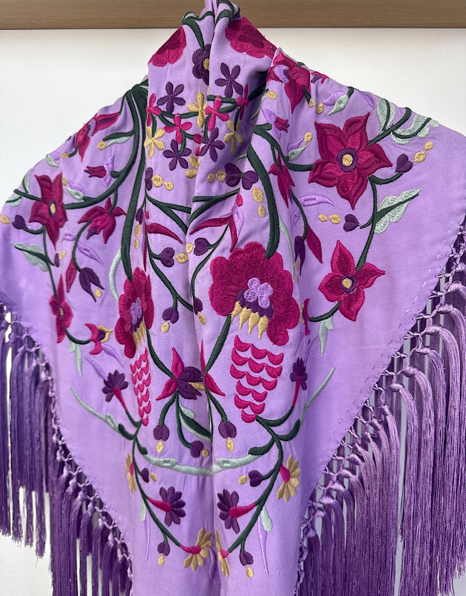 La base está confeccionada en viscosa de algodón, una fibra derivada de celulosa que destaca por su suavidad y por cómo cae sobre los hombros. Este mantoncillo está hecho en Sevilla de principio a fin. Lleva flecos de seda de borlón elaborados artesanalmente.