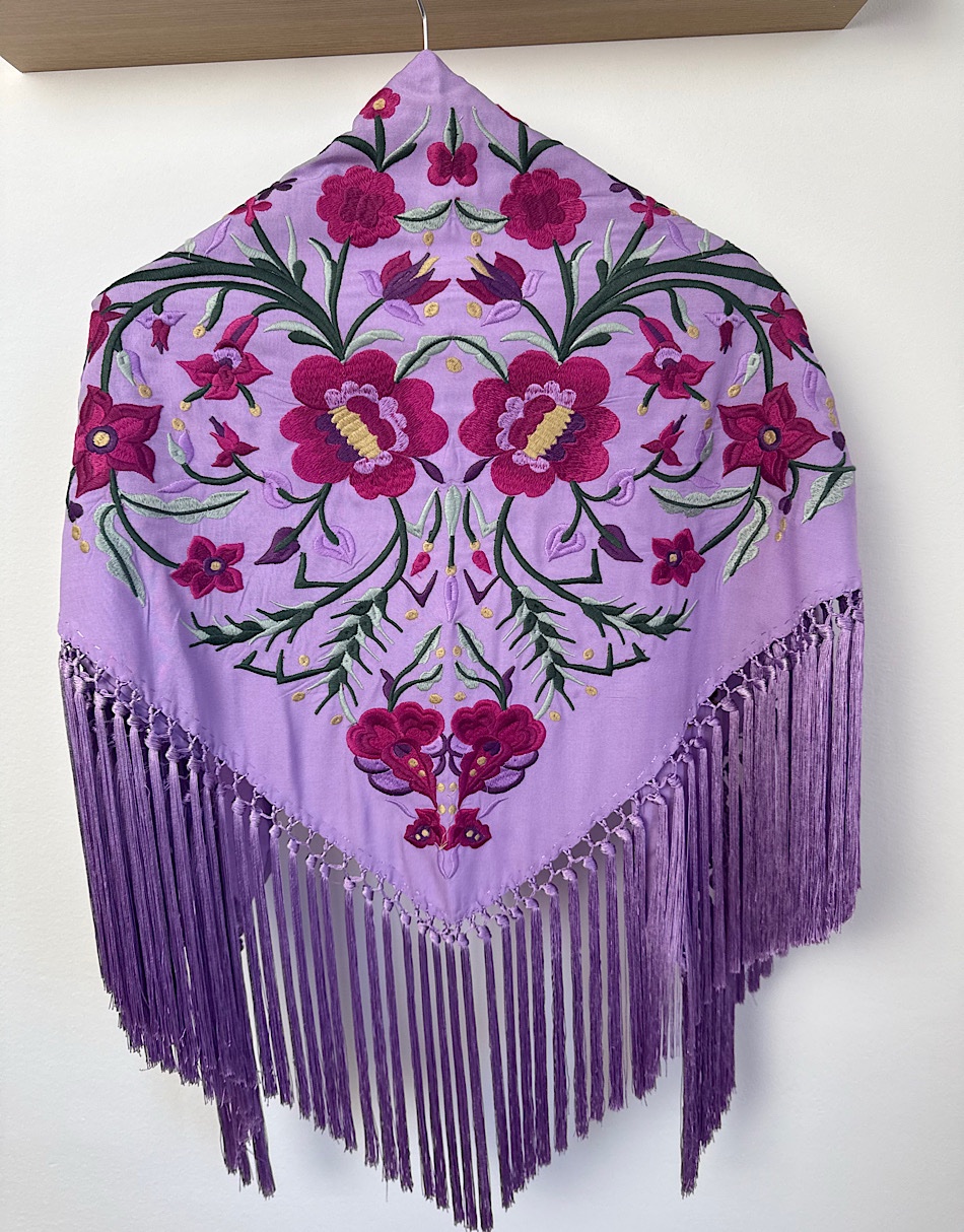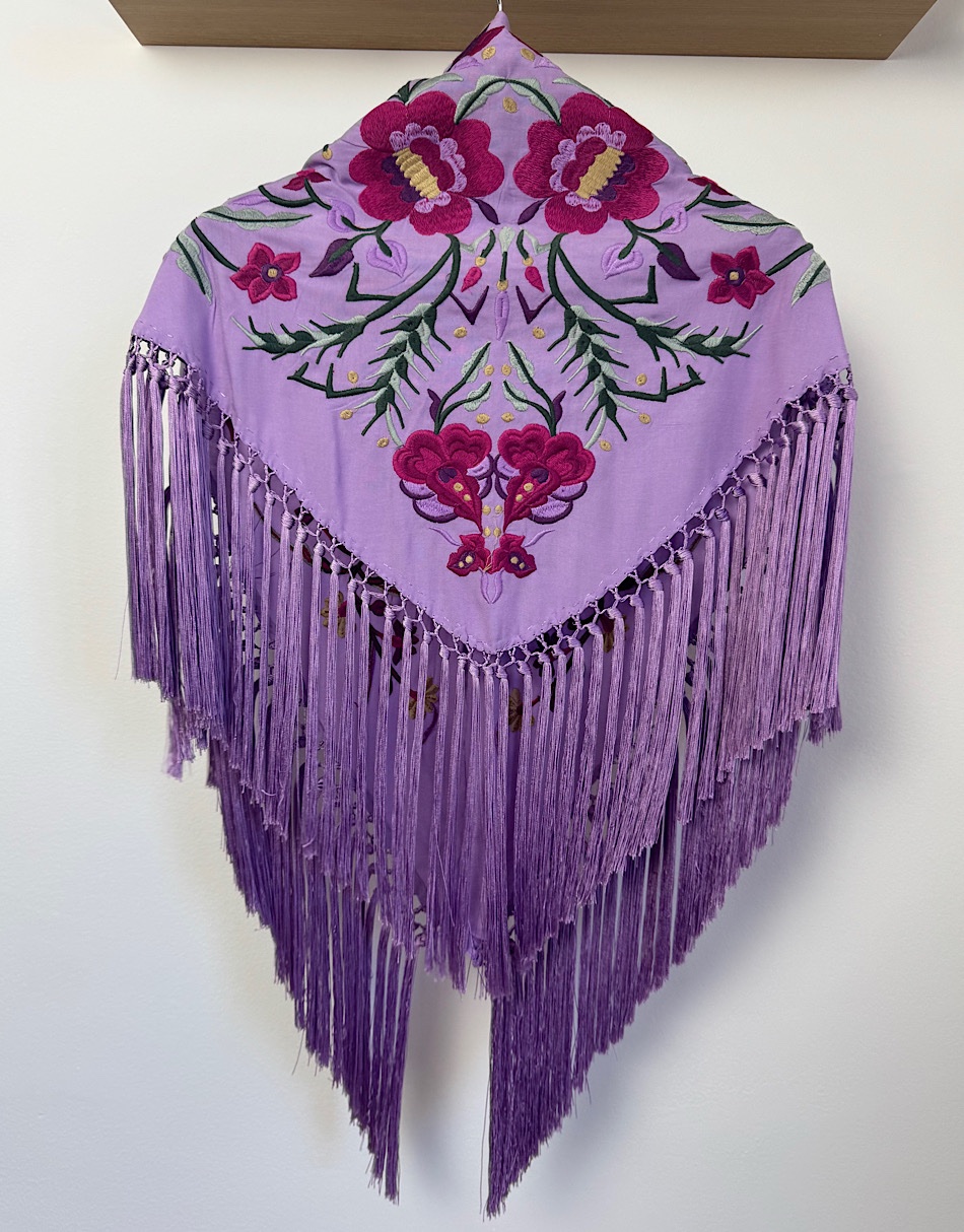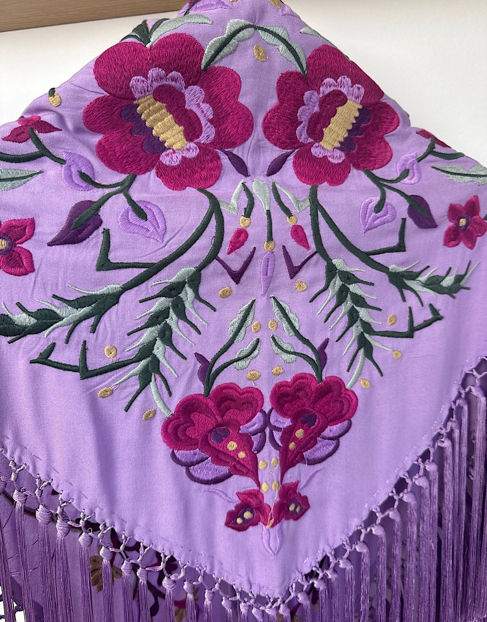 La base está confeccionada en viscosa de algodón, una fibra derivada de celulosa que destaca por su suavidad y por cómo cae sobre los hombros. Este mantoncillo está hecho en Sevilla de principio a fin. Lleva flecos de seda de borlón elaborados artesanalmente.